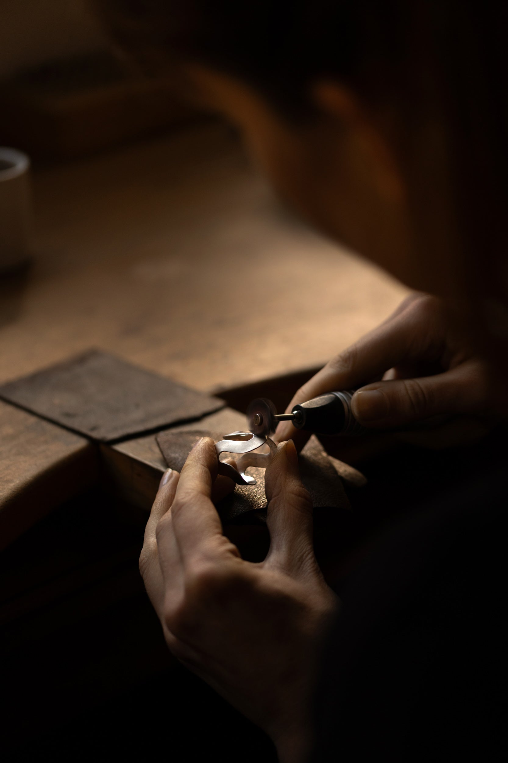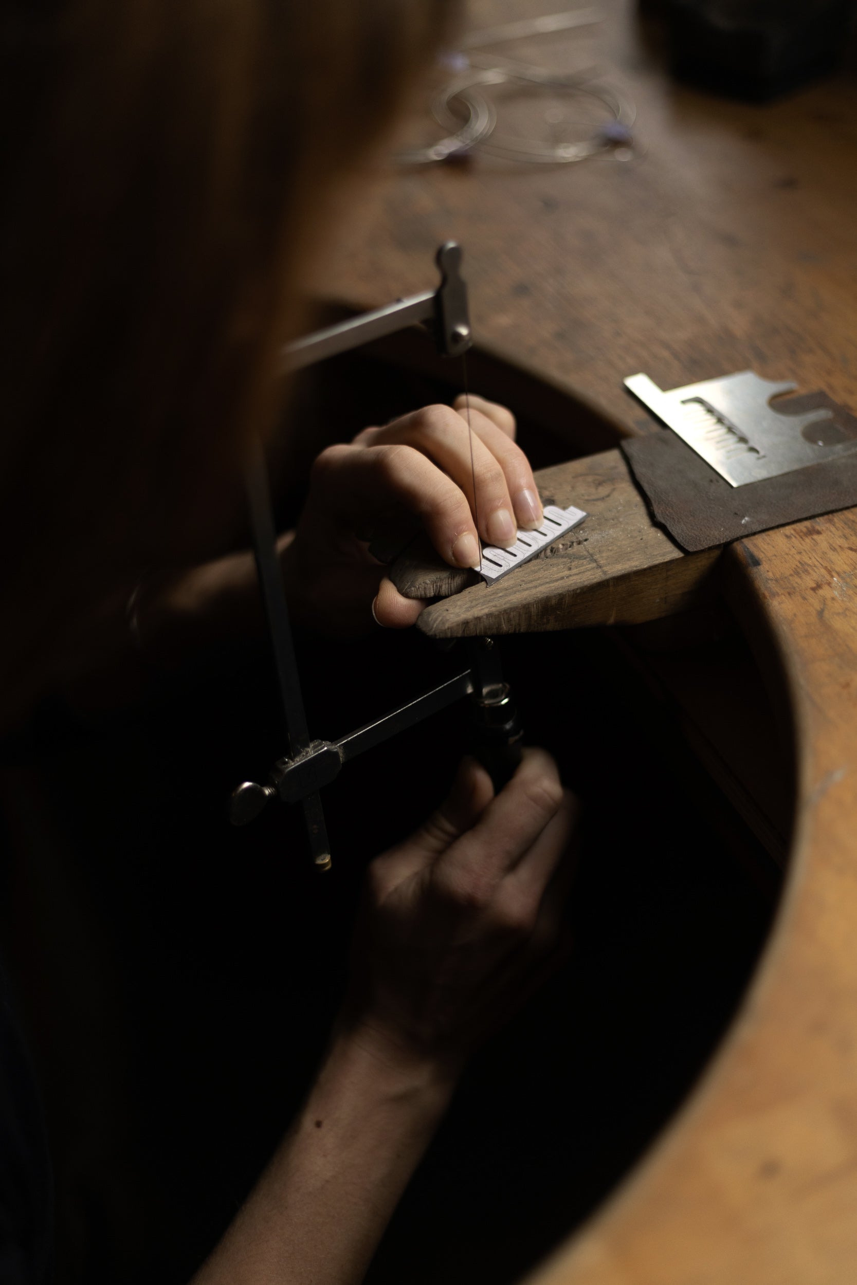 Je dessine et fabrique chaque bijou à la main. Le métal est fondu, laminé, forgé, scié, limé, soudé, poli... et poinçonné avec soin dans mon atelier.